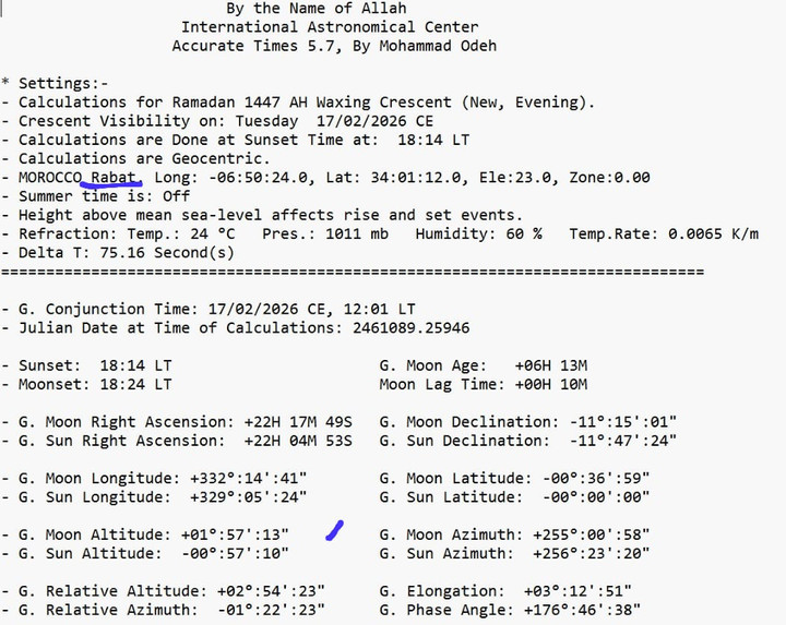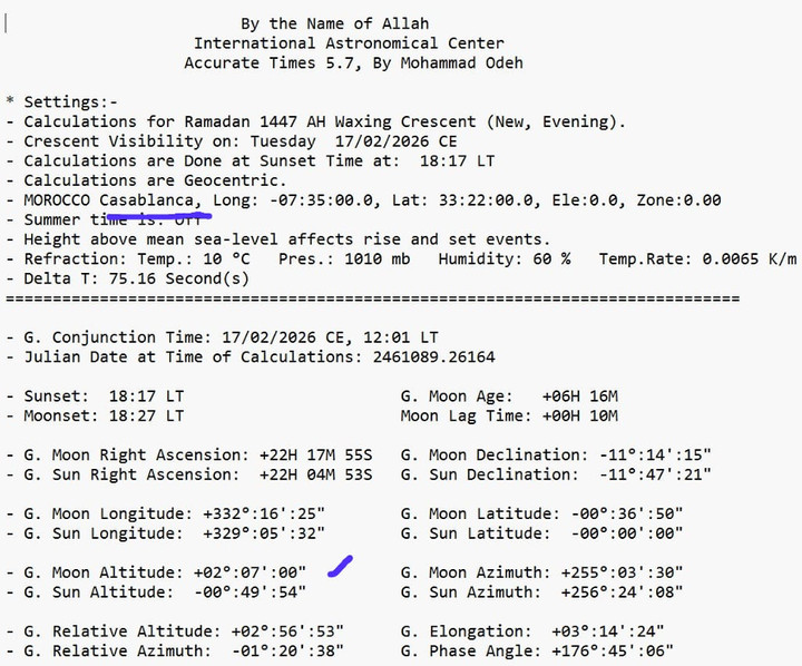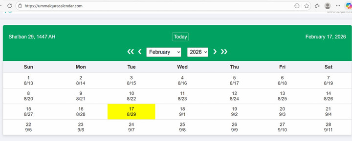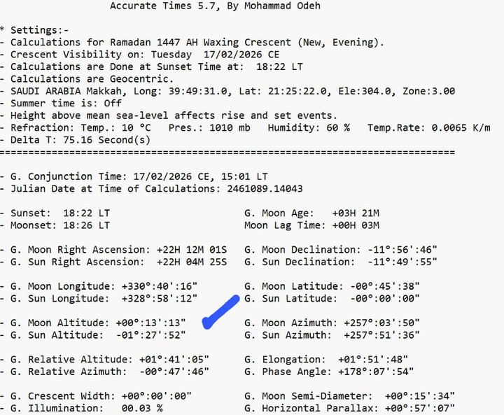 Di kota suci Makkah, Arab Saudi, matahari terbenam pada pukul 18:22 waktu setempat. Pada saat yang bersamaan, bulan terbenam pada pukul 18:26. Ini berarti hilal sudah wujud di atas ufuk dengan ketinggian yang terukur, yakni +00°:13′:13″. Meskipun ketinggian ini terbilang sangat tipis dan mungkin tidak memungkinkan untuk dilihat dengan mata telanjang, secara astronomis bulan sudah berada di atas ufuk setelah matahari terbenam. Kondisi ini secara tegas memenuhi kriteria masuknya bulan baru dalam sistem kalender Ummul Qura yang menjadi pegangan resmi Arab Saudi. Penting untuk dicatat bahwa dalam kalender resmi Arab Saudi sendiri, 1 Ramadan 1447 H telah ditetapkan jatuh pada tanggal 18 Februari 2026, yang sejalan dengan penetapan Muhammadiyah.