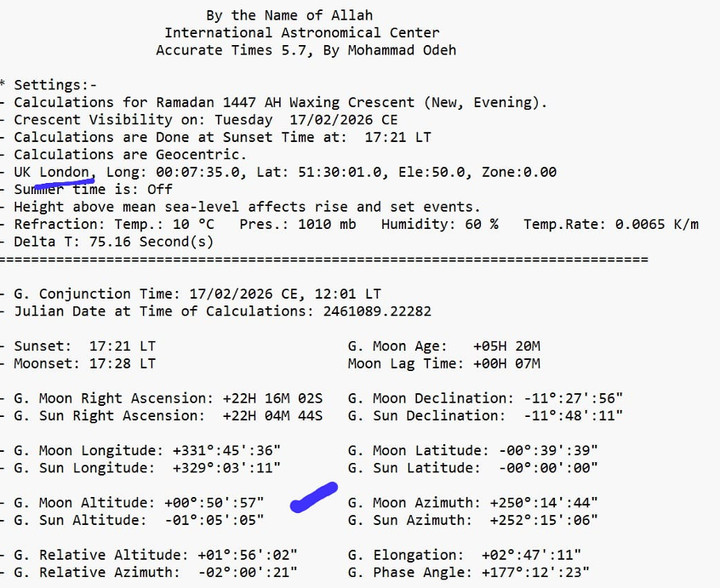 Tidak hanya di Timur Tengah dan Afrika, data astronomis juga menunjukkan eksistensi hilal di Eropa. Di London, Inggris, hilal tercatat berada pada ketinggian +00°:50′:57″ saat matahari terbenam pada tanggal 17 Februari 2026. Data-data ini, dari Makkah hingga London, berfungsi sebagai “bukti sekunder” yang krusial. Mereka secara kolektif menegaskan bahwa pada tanggal 17 Februari petang waktu setempat, hilal 1 Ramadan 1447 H sesungguhnya telah eksis di ufuk barat berbagai belahan bumi, mulai dari Timur Tengah, Afrika Utara, hingga Eropa. Ini memberikan landasan hisab yang kuat untuk penetapan awal Ramadan secara global.
