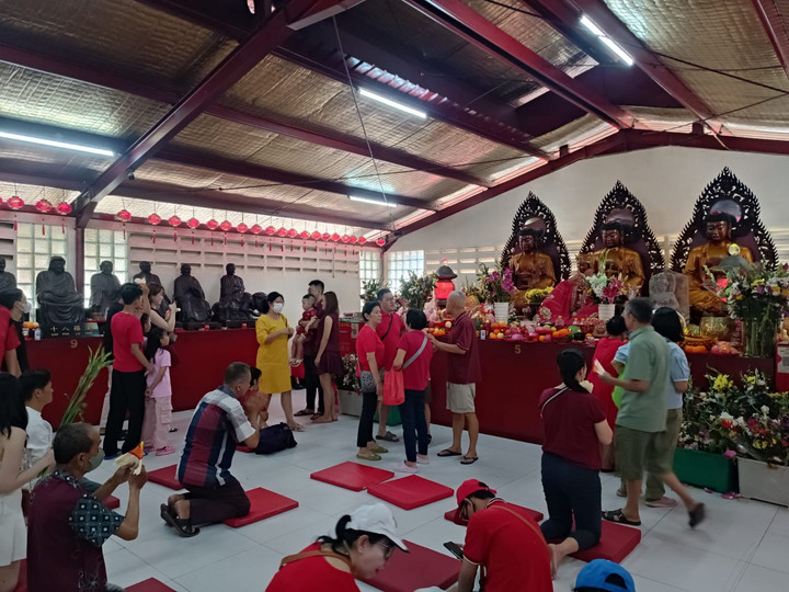 Pengalaman beribadah di Vihara Dharma Bhakti terbagi menjadi dua area utama yang memiliki kekhasan tersendiri: area ‘langit’ dan area ‘bumi’. Begitu tiba di kompleks vihara, para pengunjung diarahkan untuk memulai rangkaian ibadah mereka di area ‘langit’. Di ruang-ruang yang terletak di bagian atas vihara ini, suasana terasa lebih personal dan mendalam. Banyak jemaat terlihat khusyuk duduk, bersujud, atau merapalkan doa-doa mereka, terbungkus dalam keheningan yang hanya dipecah oleh bisikan-bisikan permohonan. Beberapa pengunjung bahkan memanfaatkan momen kebersamaan keluarga dengan mengabadikan momen tersebut melalui foto, menambah kehangatan dalam suasana spiritual.