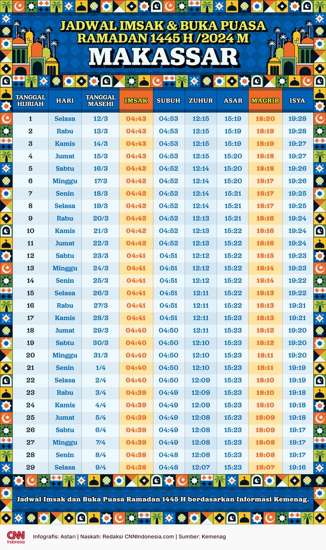 Berikut adalah ilustrasi struktur jadwal yang biasanya menjadi acuan dalam Jadwal Imsakiyah Ramadan untuk wilayah Makassar dan sekitarnya: