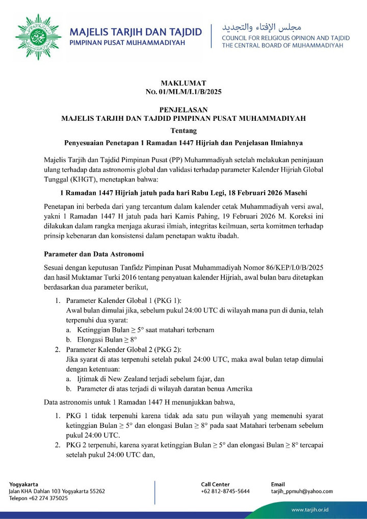 Di sisi lain, Pimpinan Pusat Muhammadiyah melalui Majelis Tarjih dan Tajdid telah mengeluarkan maklumat resmi terkait penetapan awal bulan Ramadan 1447 Hijriah. Berdasarkan perhitungan astronomi yang mereka lakukan, Muhammadiyah menetapkan bahwa 1 Ramadan 1447 H akan jatuh pada hari Rabu, 18 Februari 2026. Maklumat ini tertuang dalam surat bernomor 01/MLM/I.1/B/2026, yang telah disebarkan kepada seluruh jajaran Muhammadiyah. Penetapan ini menunjukkan adanya perbedaan pandangan dalam penentuan awal Ramadan antara metode yang digunakan oleh Kemenag dan Muhammadiyah, yang merupakan hal yang lumrah terjadi dalam tradisi penentuan awal bulan hijriah di Indonesia. Perbedaan ini biasanya bersumber dari perbedaan metode hisab dan kriteria rukyatul hilal yang diterapkan oleh masing-masing lembaga. Meskipun demikian, kedua belah pihak senantiasa mengedepankan semangat ukhuwah Islamiyah dan menghargai perbedaan yang ada. Bagi Muhammadiyah, Idul Fitri 1 Syawal 1447 H diprediksi akan jatuh pada hari Jumat, 20 Maret 2026.
