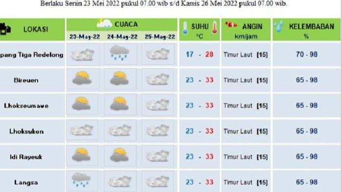 Puncak dari prediksi tiga hari ini terjadi pada hari Rabu, 4 Maret 2026. Pada hari terakhir periode prakiraan, wilayah Bener Meriah, Lhokseumawe, Aceh Utara, Aceh Timur, dan Langsa diprediksi akan berawan. Namun, untuk Bireuen, BMKG memprediksi akan terjadi hujan ringan. Variasi ini menegaskan bahwa kondisi cuaca di Aceh cenderung dinamis, dengan potensi hujan ringan yang tersebar di beberapa titik pada hari-hari tertentu.