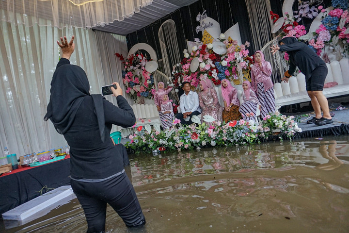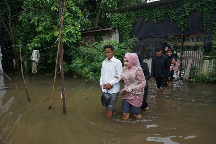 Keanggunan mempelai wanita menjadi elemen yang paling memukau dalam peristiwa ini. Meskipun lingkungan di sekitarnya dipenuhi air yang membawa material lumpur, ia tetap tampil paripurna dengan busana pengantin yang sarat akan detail payet dan bordir halus. Riasan wajah atau make-up yang diaplikasikan oleh penata rias profesional tampak tetap segar dan tidak luntur, memberikan kontras visual yang dramatis terhadap latar belakang air banjir yang keruh. Sang mempelai wanita harus ekstra hati-hati saat melangkah menuju kursi pelaminan, mengangkat sedikit gaun panjangnya agar tidak basah kuyup terkena air. Ketegaran yang terpancar dari wajah kedua mempelai seolah memberikan pesan bahwa cinta dan komitmen mereka jauh lebih kuat daripada rintangan alam yang sedang mereka hadapi. Para tamu undangan pun, yang sebagian besar merupakan warga sekitar yang juga terdampak banjir, menunjukkan solidaritas yang tinggi dengan tetap hadir memberikan doa restu, meskipun mereka harus basah-basahan untuk mencapai lokasi acara.