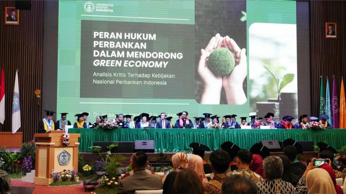 Dalam upacara pengukuhan yang khidmat, Prof. Dr. Hassanain Haykal, S.H., M.Hum., menyampaikan orasi ilmiahnya yang bertajuk “Peran Hukum Perbankan dalam Mendorong Green Economy: Analisis Kritis terhadap Kebijakan Nasional Perbankan Indonesia”. Dalam orasinya, Prof. Haykal dengan tegas menekankan bahwa hukum perbankan tidak hanya berfungsi sebagai instrumen kontrol semata, melainkan memiliki peran transformatif yang krusial dalam mewujudkan keadilan ekologis. Pandangannya ini membuka perspektif baru mengenai keterkaitan erat antara regulasi perbankan dengan upaya pelestarian lingkungan dan pembangunan ekonomi hijau.