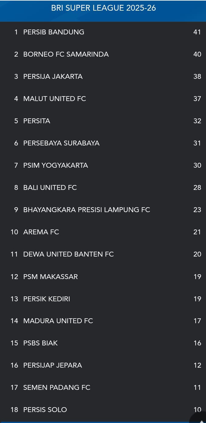 Klasemen Sementara Liga Super Indonesia 2025/2026 (Setelah Pekan ke-18)
